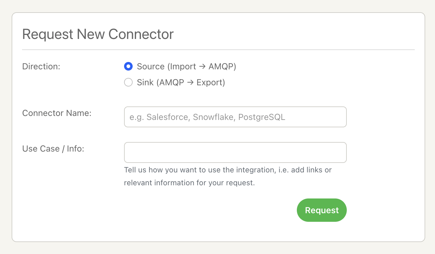 If you are looking to move data in, or out of, AMQP i.e. connecting your message broker (AMQP) to external databases or SaaS platforms, use the Connector request form. You can specify the direction of data flow: