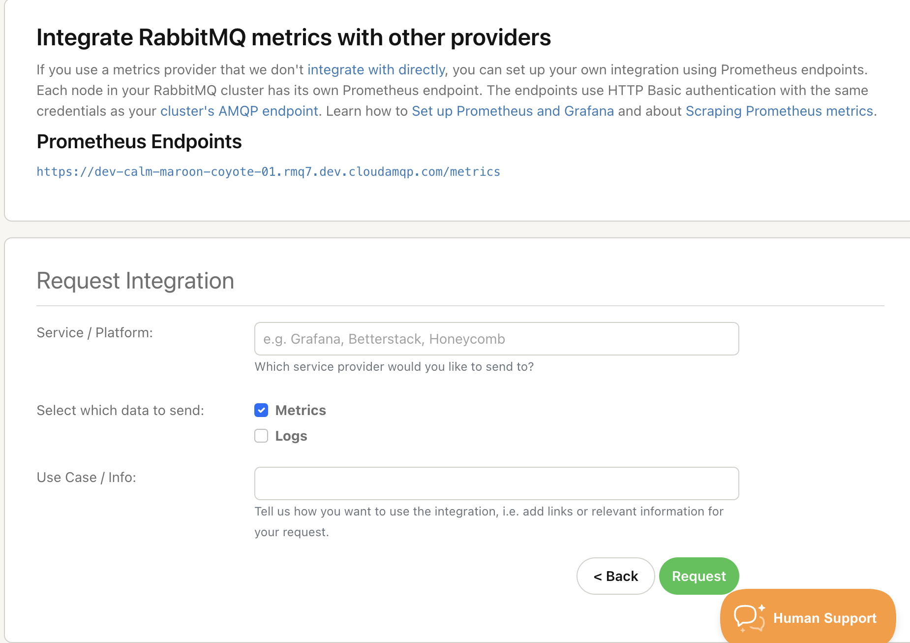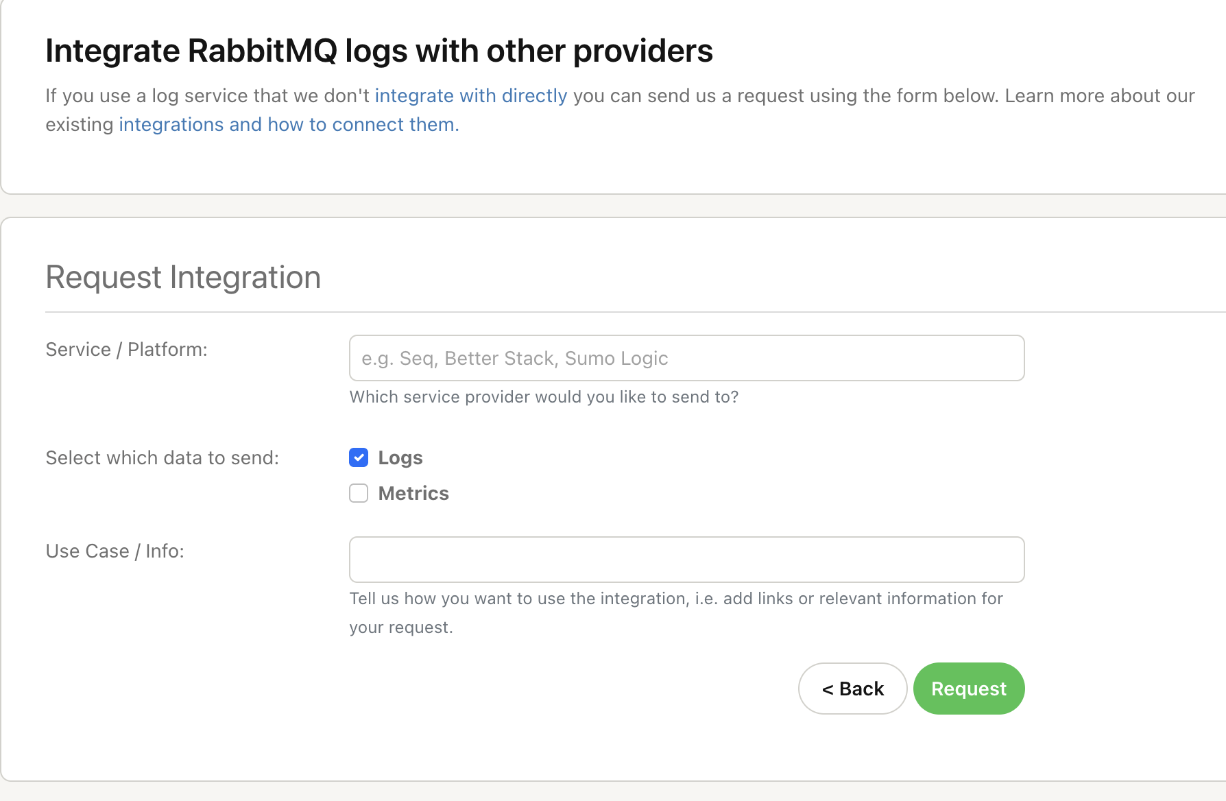 If you are trying to visualize what’s happening inside your message broker or need to centralize your logging, these are the request forms for you. It’s easy to request both from the same third-party integration if that suits your setup, or tell us where each should go. We already support direct integrations for the following: